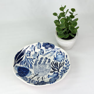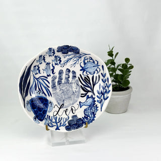 This Beachy Chinoiserie Dish is the perfect home decor item to add coastal chic to any room! It beautifully captures your child's playful handprint in a unique design that is certain to be a conversation starter. Perfect for bringing the beach vibes into your space, whether you're hitting the sand or just dreaming about it!