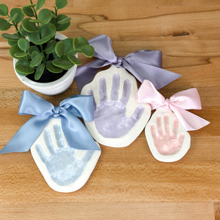 *Clay Disclaimer: Due to the creating and multi firing process of clay plaques and ornaments, there is water loss and shrinkage. The final products may be slightly smaller than your child’s actual prints.