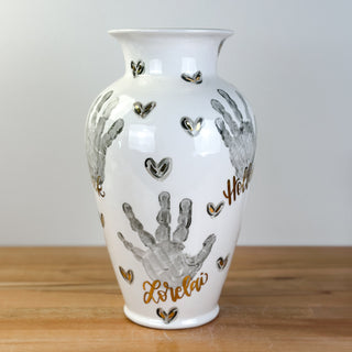 XL Vases accommodate 1-6 children, any age and are great for a bouquet of long stem flowers! Print layouts depend on number and age of children, if more than one child is going on the piece there will be one handprint per child.