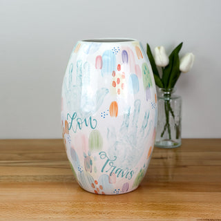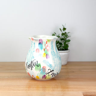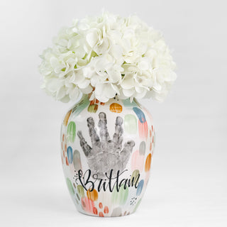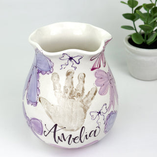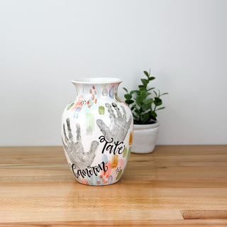 Petite Vases accommodate 1-2 children, up to 5yrs of age and are great for a bouquet of short stem flowers! Print layouts depend on number and age of children, if more than one child is going on the piece there will be one handprint per child.