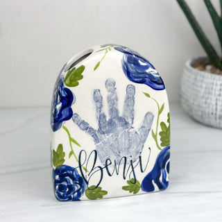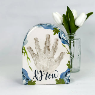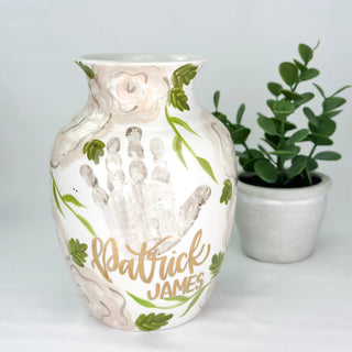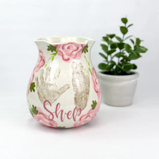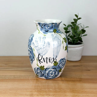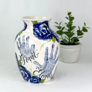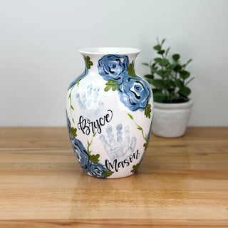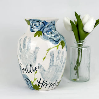 Petite Vases accommodate 1-2 children, up to 5yrs of age and are great for a bouquet of short stem flowers! Print layouts depend on number and age of children, if more than one child is going on the piece there will be one handprint per child.