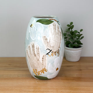 Vases accommodate 1-4 children, any age and are great for a bouquet of medium to long stem flowers! Print layouts depend on number and age of children, if more than one child is going on the piece there will be one handprint per child.