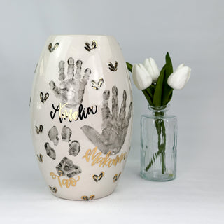 Vases accommodate 1-4 children, any age and are great for a bouquet of medium to long stem flowers! Print layouts depend on number and age of children, if more than one child is going on the piece there will be one handprint per child.